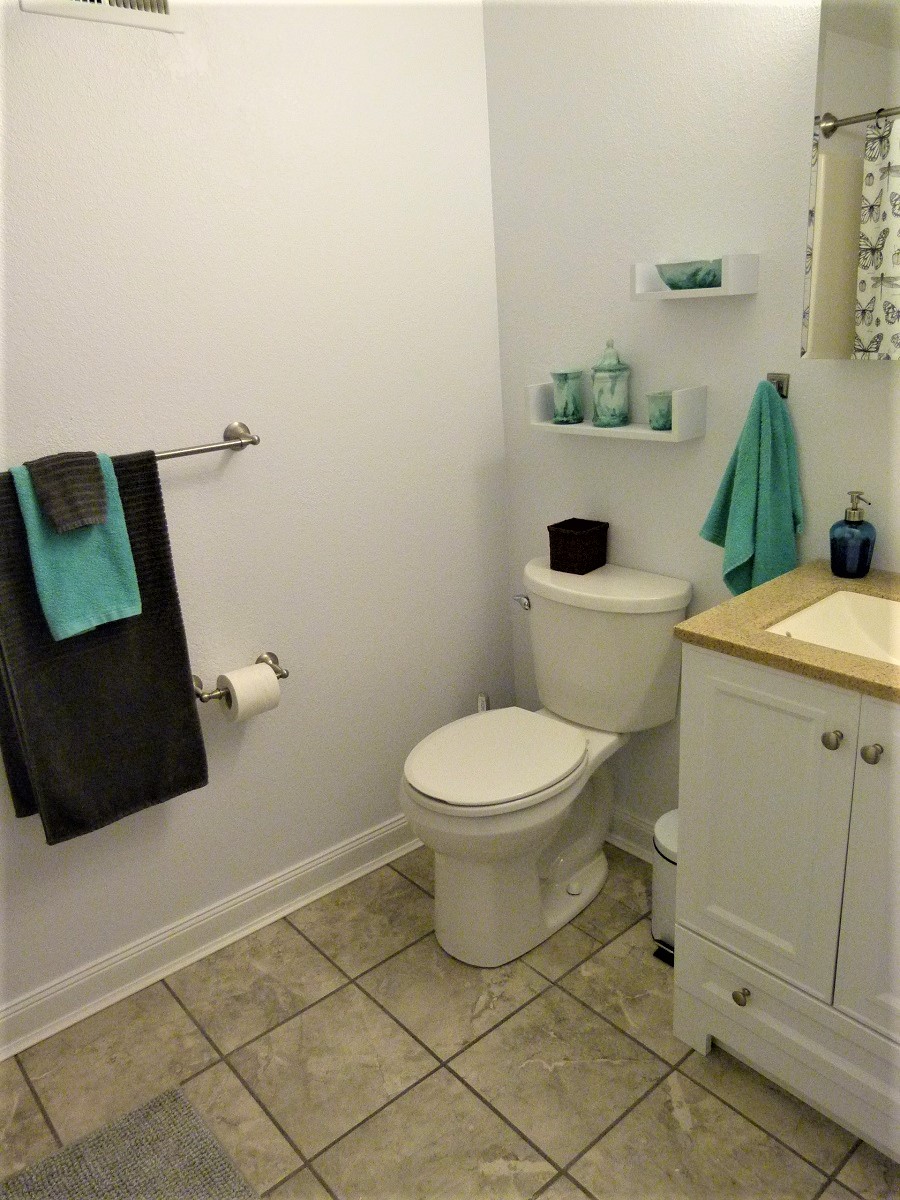 The main floor also hosts 2 guest rooms, each with a queen-size bed, that share a full bath with a shower/tub combo.
